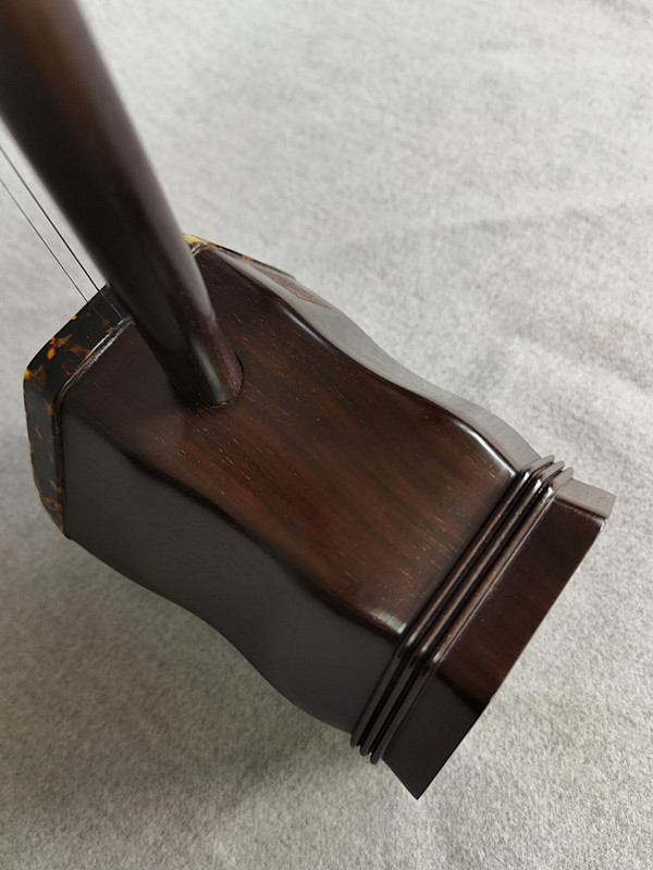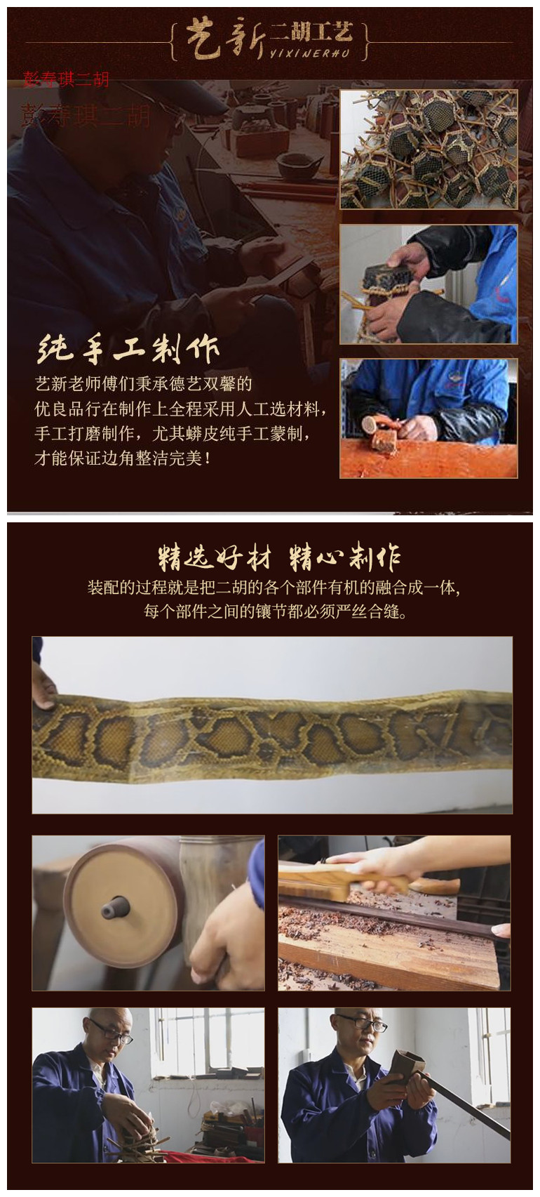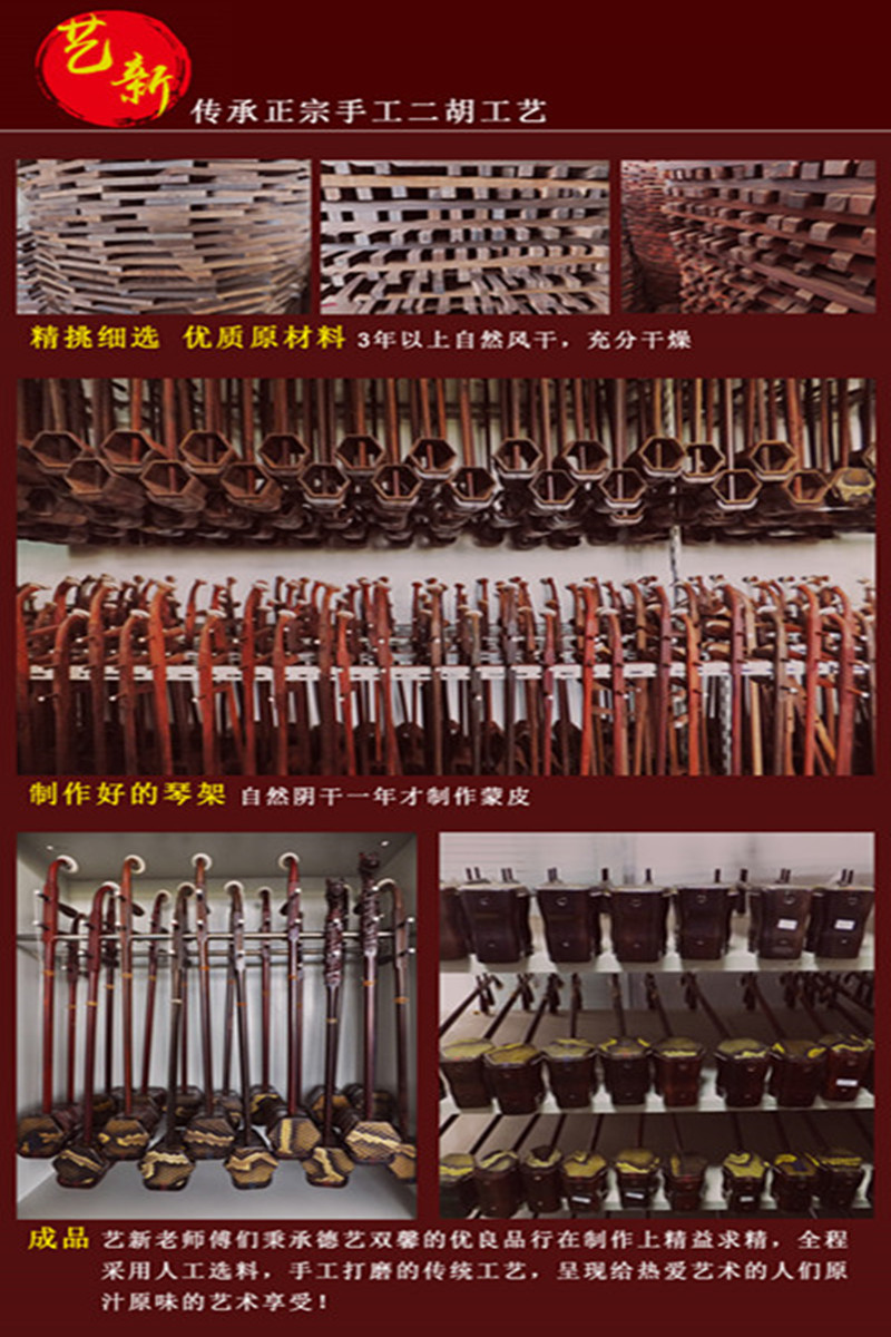 彭寿琪精演奏级明清老红木二胡,是二胡高档的产品之一,其制作选材的要求完全是依据演奏家的要求,工艺上非常严格,工序也很复杂,对木料的干燥和木材本身的质地,木料我们一般都是存放3年才制作,蟒皮的质量,厚薄,都有很高的要求。二胡的制作在选材上都应依据力学和声学的原理,二胡的整体是一个振动体,对二胡的每一部位的材料都要符合其振动的原理,良好的振动无疑也产生好的音色。在制作过程中的每一个细节都会对音色产生影响,从实践中摸索出了一整套二胡选材,制作工艺,和鞔皮的工艺流程。每一种材料,每一张皮都有它们的特性,千篇一律的套用是绝对制不好二胡的,在实践中我们也深刻的认识到了。对于明清老红木的制作,用独到的工艺。制作的明清老红木二胡工艺精致,细腻,琴身全手工打磨,手感较好,更好的体现二胡那种淳朴,浑厚,柔美,圆润的特点
