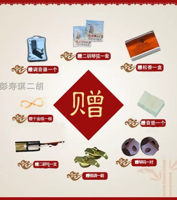 ,使其成为二胡爱好者值得收藏的二胡之一.出厂配有高级二胡琴盒,84厘米专业二胡弓,专业二胡弦,琴马,音管,松香,微调
